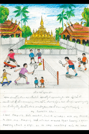 バドミントンをするのが好きです。時間がある時は、友だちといっしょにタート・ルアン(仏塔)の運動場でバドミントンをしています。この活動は、ぼくたちの連帯感を強めてくれます。