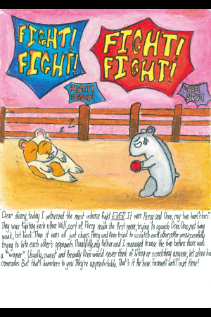親愛なる日記さん、今日私はこれまでで最も激しいケンカを目撃しました。それはパーシーとオレオ、私の2匹のハムスターでした。彼らはケンカしました。まあ、ある意味で、ですね。パーシーは先に動き出し、オレオを押しつぶそうとしました。オレオも負けないようにかみ返そうとしました。 それからは全て混乱でした。パーシーとオレオは、お互いにかもうとしましたが失敗して、お互いを引っかこうとしました。幸いにも、お父さんと私は「勝者」が出る前に2匹を救うことができました。普段、かわいくてフレンドリーなオレオは、仲間はもちろん、誰かをかんだり引っかいたりすることは考えられません。しかし、彼らはハムスターです。予測不可能です。今のところは以上です。それではまた次回!