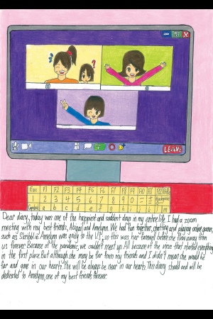 親愛なる日記さん、今日は私の人生で最も幸せで悲しい日でした。親友のアビゲイルとアメリンとオンラインで会いました。オンラインゲームで遊んだり、話したりして、いっしょに楽しみました。アメリンはアメリカに引っ越すので、今日は彼女が私たちから永遠に離れる前のお別れ会でした。パンデミックのため、私たちは会うことができませんでした。そもそも全ては新型コロナウイルスのせいです。しかし、彼女は私たちから遠く離れてしまうかもしれませんが、私たちの心から離れて消えるわけではありません。彼女はいつも私たちの心の近くにいます。この日記は、永遠に私の親友のひとりであるアメリンに捧げられるでしょう。