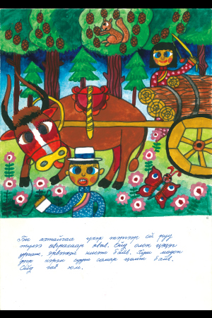 私とお兄さんは薪を取りに森へ行きました。森にはたくさんの花が咲き、チョウが飛んでいました。リスが杉の木に座って木の実を食べていました。森は美しいです。