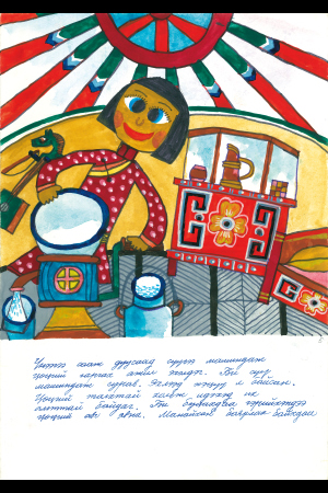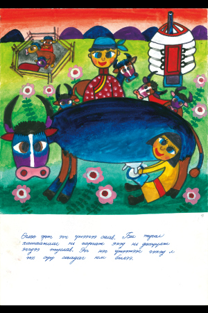 早朝、お姉さんは牛の乳しぼりをしていました。私は子牛を納屋から出して、お姉さんを手伝いました。お姉さんは牛からたくさんの乳をしぼりました。
