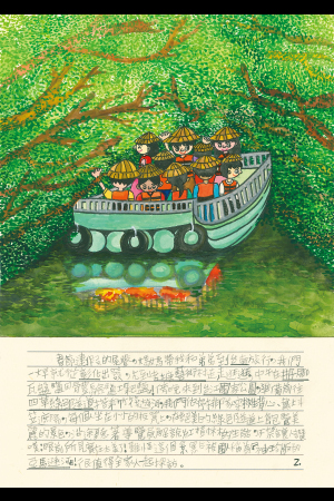 春休みの終わりに、お母さんはぼくと弟を台南への旅行に連れていってくれました。ぼくたちは早朝にジャンホワを出発し、先にラオタンフー芸術村へ行って散策しました。昼にジンザジャオワパン塩田(タイルを敷きつめて作った台湾最古の塩田)で塩の採集を体験しました。午後はスーツァオ・スイダオの緑のトンネルに行き、川沿いのいかだに乗りました。ぼくたちは安全のためのライフジャケットと、日よけの麦わら帽子を並んで受けとりました。全員が小さなベンチに座って美しい緑の水路に入り、ツアーガイドの話に耳を傾けてマングローブの環境生態系の紹介を聞きました。なんてすばらしい!目の前の風景はとても美しいです。この場所が「台湾のミニアマゾン川」と呼ばれているのも不思議ではありません。訪問するのにとても良い場所です。