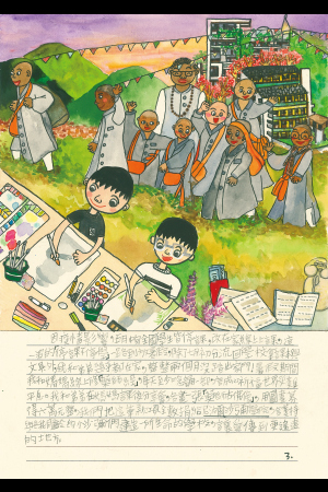 5月中旬に新型コロナウイルスの流行が拡大したため、政府は島内の全ての学校を休校にし、オンライン授業を開始しました。今回の休校とオンライン授業は夏休みまで続けられました。ぼくと弟は、7月に分散登校で教科書と文房具を取りに学校に一時的に戻った以外は、丸2か月間家にいました。夏の間、ぼくとお母さんは薬師如来のオンライン講座を受講し、全世界の平和と回復を祈るために少なくとも1日1回マントラ(祈り)を唱えました。ぼくと弟は、お母さんのクラス後にそれぞれ薬師如来の絵を描き、60,000台湾ドルの募金を集めました。ぼくたちはその全額をネパールのシュラーマネラー学校に寄付して、ぼくと同じくらいの年齢の多くの僧侶の家である、学校を支援します。ぼくたちは愛と優しさをもっと遠くの場所に広めたいと思っています。