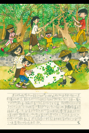 週末、お母さんはぼくと弟を、梅の収かくをしに山へ連れていってくれました。そこで初めて、梅は手でつむのではなく、長い竹の棒を使ってたたき落とすことを知りました。大きな網を地面に広げ、順番に竹の棒を使って木の枝をたたくと、緑の梅が地面に落ちてきます。それらをバケツに集めて、カリッとする梅の漬物を作りました。梅を洗った後、砂糖と塩が梅によく染み込むようにナイフを使って梅の外皮を少し切り、よく漬け込みました。この手順を考えるだけでも、よだれをたらしてしまいました。食べるのが待ちきれません。なんて楽しくてリラックスできる週末。来年梅の季節になったら、またお母さんといっしょにここに来たいです。