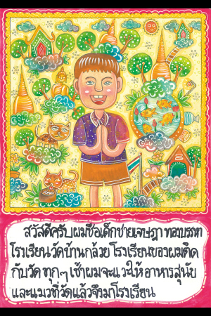 こんにちは。ぼくはワトバン小学校のジェーサダー・トーンバンハーです。ぼくの学校はお寺の隣にあります。毎朝、ぼくはお寺に立ちより、そこにいる犬と猫にエサをやってから、学校へ行きます。