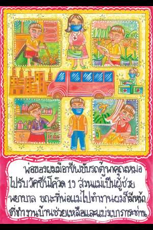 ぼくのお父さんは、お医者さんを新型コロナウイルスのワクチン接種会場に連れていく車の運転手です。お母さんは看護助手です。両親が仕事に出ている間に家事を手伝うのがぼくの仕事で、ふたりを助け、負担を軽くしています。