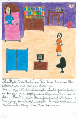 私は朝起きるとベッドを出て、朝のお祈りをします。その後、ベッドや部屋を整えて学校に行く準備をします。そしてお母さんが部屋に来て、「マリルハ、お皿を洗って、部屋をきれいにしてバルコニーに水をまいてから朝ご飯を食べなさい。終わったら学校に行ってらっしゃい。」と言います。私は「はい、お母さん、すぐやります。」と答えます。