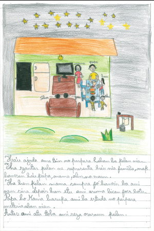 これは、私の通うアイナロ小学校の絵です。友だちといっしょに勉強したり、遊んだりする場所です。私は毎日友だちのマキシミリアナといっしょに学校に行きます。なぜならマキシミリアナは私の親友だからです。私たちはいつもいっしょに歩きます。