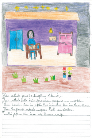 私は算数の勉強をします。そして歯をみがき、足を洗って寝ます。明日マキシミリアナといっしょに学校に行くことを考えています。私は将来医者になりたいので、一生けん命勉強しなければなりません。未来は自分の手にかかっています。