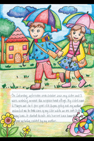 2021年10月9日土曜日の午後、ぼくと妹は近くの村に行き、散策をしました。妹の名前はナイラ、4歳です。出かける前に、お母さんから「外ではしっかり妹の面倒をみるように。」と任せられました。帰り道、雨が降ってきたので、お母さんに怒られないよう急いで家に戻りました。