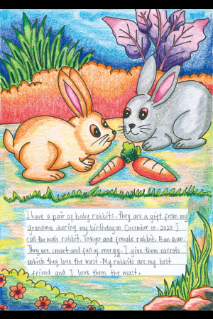 ぼくは2羽の子ウサギを飼っています。2020年12月15日のぼくの誕生日に、おばあちゃんからプレゼントされた子ウサギです。オスのウサギを「トウキョウ」、メスのウサギを「ブンブン」と呼んでいます。かしこくて元気いっぱいです。大好きなにんじんをあげます。ウサギはぼくの親友で、大好きです。
