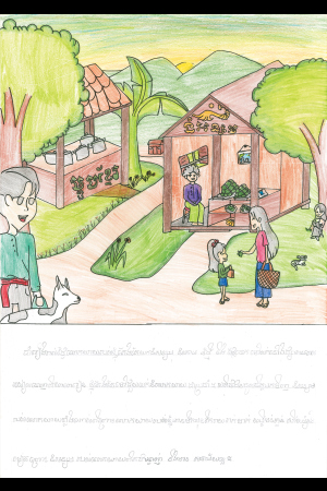 毎日、おばあちゃんはアンソム・チェック(甘くしたバナナのちまき)やアンソム・クルック(豚肉のちまき)、ヌム・コム(ココナッツや炒ったゴマなどの三角形のちまき)、ヌム・トメイ(塩味の豆のペーストの三角形のちまき)、バナナを市場へ持っていき、販売しています。私は学校の後、いつもおばあちゃんの店を手伝います。おばあちゃんはとても親切で優しく、ちまきもおいしくて衛生的なので、みんなおばあちゃんの店が好きです。