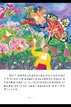 暖かくて気持ちのいい春の風が吹き、木ぎも青あおとして、凧上げには最高の日です。友だちと公園へ凧上げに行きます。私と友だちはそれぞれの凧を上げ、私たちの凧はだんだん青空に高く舞いあがりました。空は突然色とりどりの幻想的な世界に変わり、私たちはその光景に魅了されました。それらの凧を見て、私の心も空に舞いあがったみたいです。