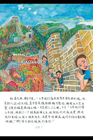 秋晴れで見晴らしが良い日です。早朝に、有名な万里の長城に登りに行きました。八達嶺は中国人の象徴であり、ほこりです。宇宙から地球を見た時に唯一見える人工建造物だと言われています。汗をかきながら、やっとの思いで高い所にある「烽火台」(敵の来しゅうを知らせるための見張り台)にたどり着き、でこぼこの低い壁から体を乗りだすと、きれいな景色がよく見えました。私たちは、「万里の長城よ。大好きです。」とさけび始めました。