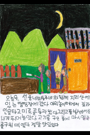 今日は、ソンウンの家族とドンジュの家族といっしょに、チリ山にあるキャンプ場へ行きました。屋外の遊び場で、わらのジップラインに乗って、迷路を通りました。そして、草原で楽しく走ってあそびました。肉を焼いた火でマシュマロを焼いてたべました。本当においしかったです。