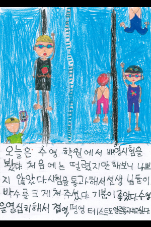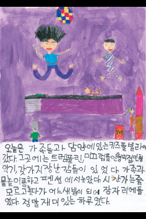 今日は家族で、ダムヤン(韓国南東の郡)にあるキッズプールヴィラに行きました。そこには、トランポリンやすべり台、人形の家、楽器など、色いろな種類のおもちゃがありました。家族と水遊びをして、ペンションでも遊びました。時間があっという間に過ぎていつの間にか夜になり、寝てしまいました。本当に楽しい1日でした。