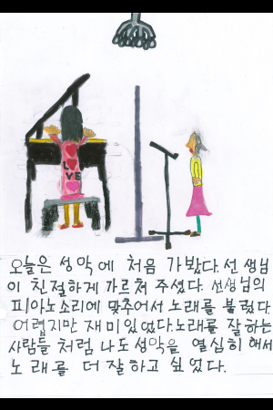 今日は初めて歌のレッスンに行ってみました。先生が親切に教えてくれました。先生のピアノの音に合わせて歌いました。難しかったけれど、楽しかったです。歌が上手な人たちのように、私もがんばって、より上手になりたいです。