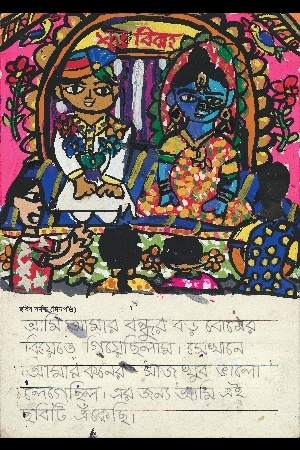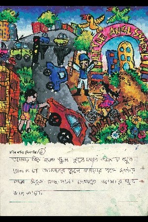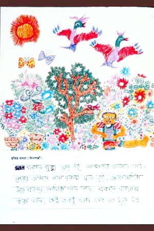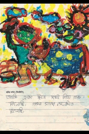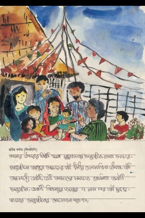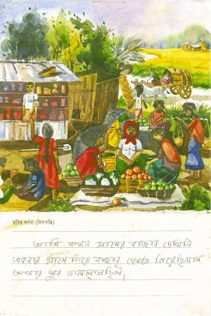 これは、バイシャキ(新年)の最初の日です。お兄さん(弟)といっしょに縁日に行きました。紙や布でできたちょうちょや花、魚、仮面、馬、ゾウなどたくさんのものがありました。お兄さん(弟)は太鼓をたたき、ぼくは仮面を持ちました。とても楽しかったです。