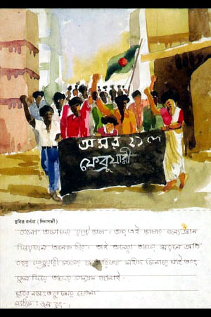 バングラ(ベンガル語)は、ぼくたちの国の言語です。大勢の人びとが、バングラを守るために命をささげました。毎年2月21日には、シェフィドミナー(ベンガル語を国語として残すために死んでいった人びとの記念碑)に行って、花をささげ、敬意をはらいます。