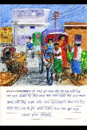 ダッカ(バングラデシュの首都)は人口密度の高い所です。下水道へのはい水が多いので、雨の時は水が道にあふれ出てきます。その時、私たちは移動することがとても困難になり、ボートやリクシャ(三輪自転車のタクシー)や車が路上を行き交います。