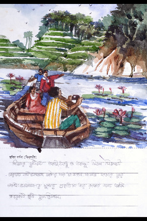 お父さんとお母さんとぼくは、冬にシレット(バングラデシュの北東部にある、茶畑で有名な地域)へ行きました。シレットで、ぼくたちは茶畑の近くの湿地でボートに乗りました。ぼくはこの美しい自然を覚えておきたくて、写真をとりました。