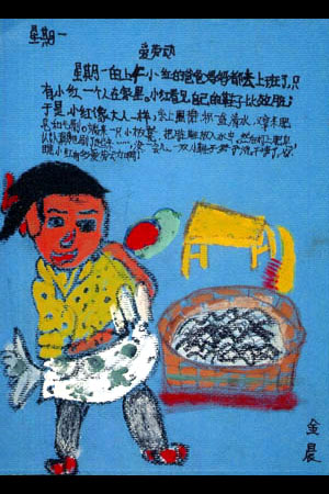 月曜日の朝、ホンちゃんのお父さんとお母さんは、彼女を置いて仕事に出かけました。ホンちゃんは汚れたくつを見ると、大人のようにエプロンをかけて、たらいに水を入れ、せっけんとブラシを持ってきました。そして小さなイスに座り、汚れたくつをたらいに入れ、せっけんをつけてていねいに洗いはじめました。しばらくしてくつを洗い終わると、くつはぴかぴかになりました。ホンちゃんは本当に働き者でしょう?