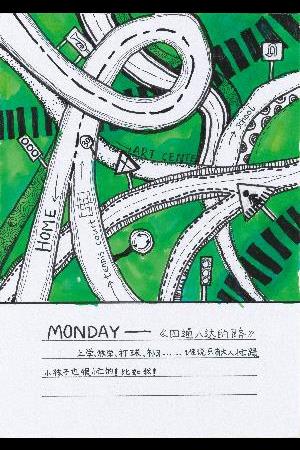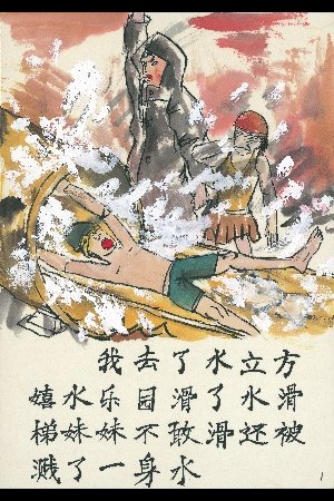 ぼくはスイリーファンウォーターパーク(北京オリンピックの水泳競技場をウォーターパークに改造したもの)へ行ってウォータースライダーをすべりました。妹はこわがってすべることができませんでした。しかも水がはねて全身びしょぬれになっていました。