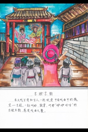 舞台の前でお年寄りの方といっしょに中国演劇の文化財、京劇を観賞しました。「イ、イ、ヤ、ヤ」という京劇の北京のイントネーションを聞いて、京劇を満きつしています。
