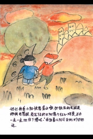 「おばあちゃん、ほら、太陽がもうすぐしずむよ。」太陽の光はやっぱりまぶしくて、卵の赤い黄身みたいです。 太陽は少しずつしずんでいきます。ぼくは太陽を指して興奮しておばあちゃんに言いました。