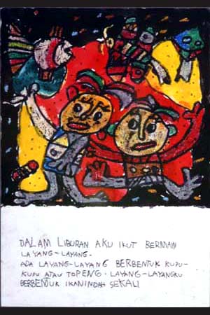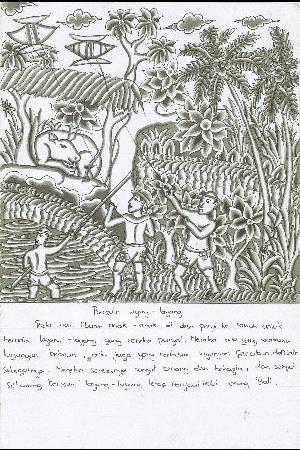 休日に、ぼくの村の子どもたちは自分の凧を持って、田んぼに行って凧上げをします。ベベアン(魚の形の凧)や、ペクカン(葉っぱの形の凧)など、色いろな種類の凧を持ってきた子がいました。子どもたちはみんなうれしそうです。今でも、凧上げはバリの人びとのしゅ味です。
