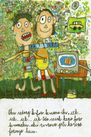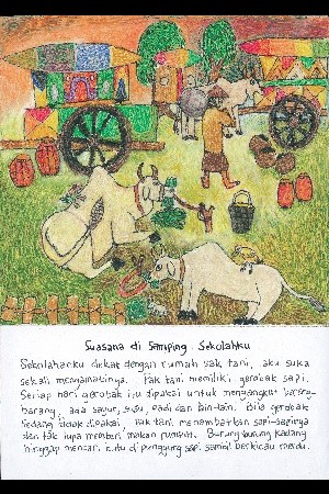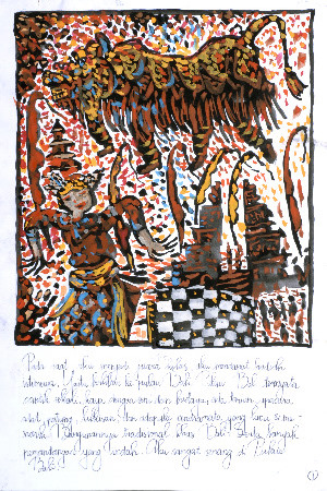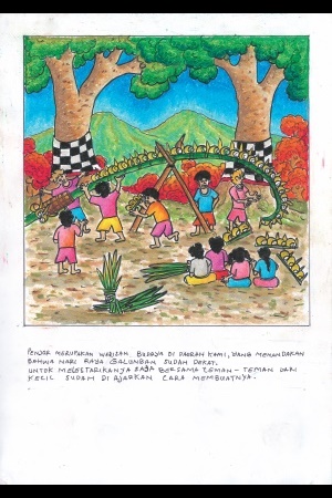 ぼくたちの最初のバロン・バクン(災いを追いはらう伝統的なダンスや、それに用いる仮面)は、ココナッツのからを半分にし、クレヨンで彩ってバロン・バクンの頭に似せたものです。ぼくの妹が踊ってくれましたが、まだ5歳なので重くてうまく踊れません。最後は、座っておどっていました。