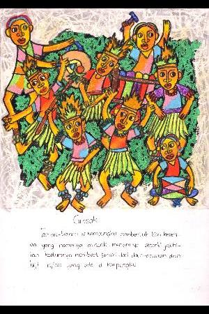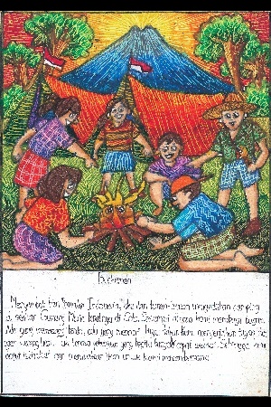 村の友だちはグラサクを踊るチームを作りました。グラサクはジャティラン(ジョグジャカルタ周辺に伝わる伝統芸能)のような踊りです。彼らは葉っぱや種で自分たちの衣装を作りました。