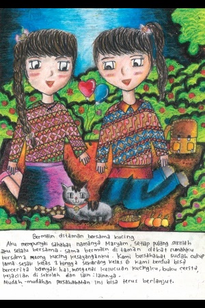 私にはマルヤムという友だちがいます。学校から帰った後、私はいつも彼女と家の近くにある公園で遊びます。私の最愛の猫、メオンもいっしょにいます。私たちの友情は、3年生から6年生の今まで続いています。私たちは色いろなことについて話します。例えば私の猫のおもしろいことや本、学校での出来事などです。私たちの友情がこれからも続くように願っています。